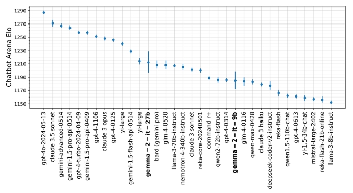 Gemma 2 有兩種大?。?0 億 (9B) 和 270 億 (27B) 個參數,上下文長度為 8K 個 token。谷歌聲稱該模型比第一代 Gemma 模型性能更好、效率更高。Gemma 2 還包含必要的安全改進。27B 模型非常強大,可以與兩倍于其大小的模型相媲美,并且可以在單個 NVIDIA H100 Tensor Core GPU 或 TPU 主機上運行,從而降低成本。