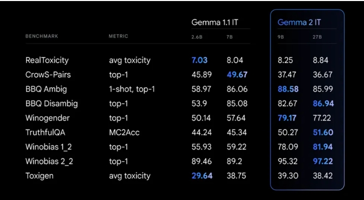 在 Gemma 2 的訓練過程中,我們遵守了嚴格的安全規程。其中包括篩選訓練前數據,并針對各種指標進行全面測試,以檢測和解決潛在的偏見和風險。